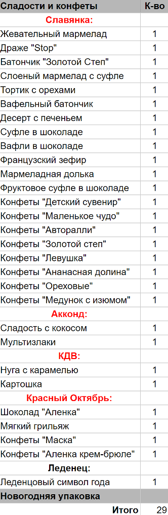 Кол-во сладостей: 29 шт.