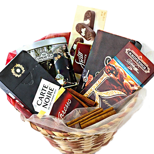 Состав: Бабаевский трюфель, Чай Ахмад ЭрлГрей, Кофе Эспрессо, шоколад коркунов, Палочки корицы, шоколадный бисквит, корзина, декор.