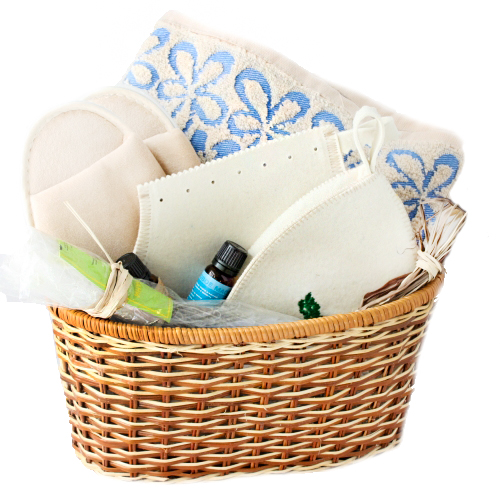 Состав: корзина с целофаном. тапки. полотенце, веник. набор Банный, арома масло 2шт , декор