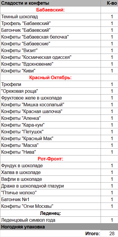 Молочный шоколад "Аленка" (1 шт), Батончик с начинкой "Аленка" (1 шт), Вафли в шоколаде (1 шт),Трюфели (1 шт), Шоколадка "Аленка" (1 шт), Фундук в шоколаде (1 шт), Печенье / пряник с медом (1 шт), Грильяж в шоколаде (1 шт), Драже в шоколадной глазури (1 шт), "Птичье молоко" (1 шт), Халва в шоколаде (1 шт), Батончик №1 (1 шт), Леденцовый символ года (1 шт)