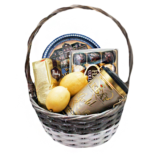 Состав : Корзина, печенье COPENHAGEN 340 гр, кофе молотый-Presidento 275 гр, чай акбар 225 гр, Ferrero Collection 172 гр, лимон 2 шт